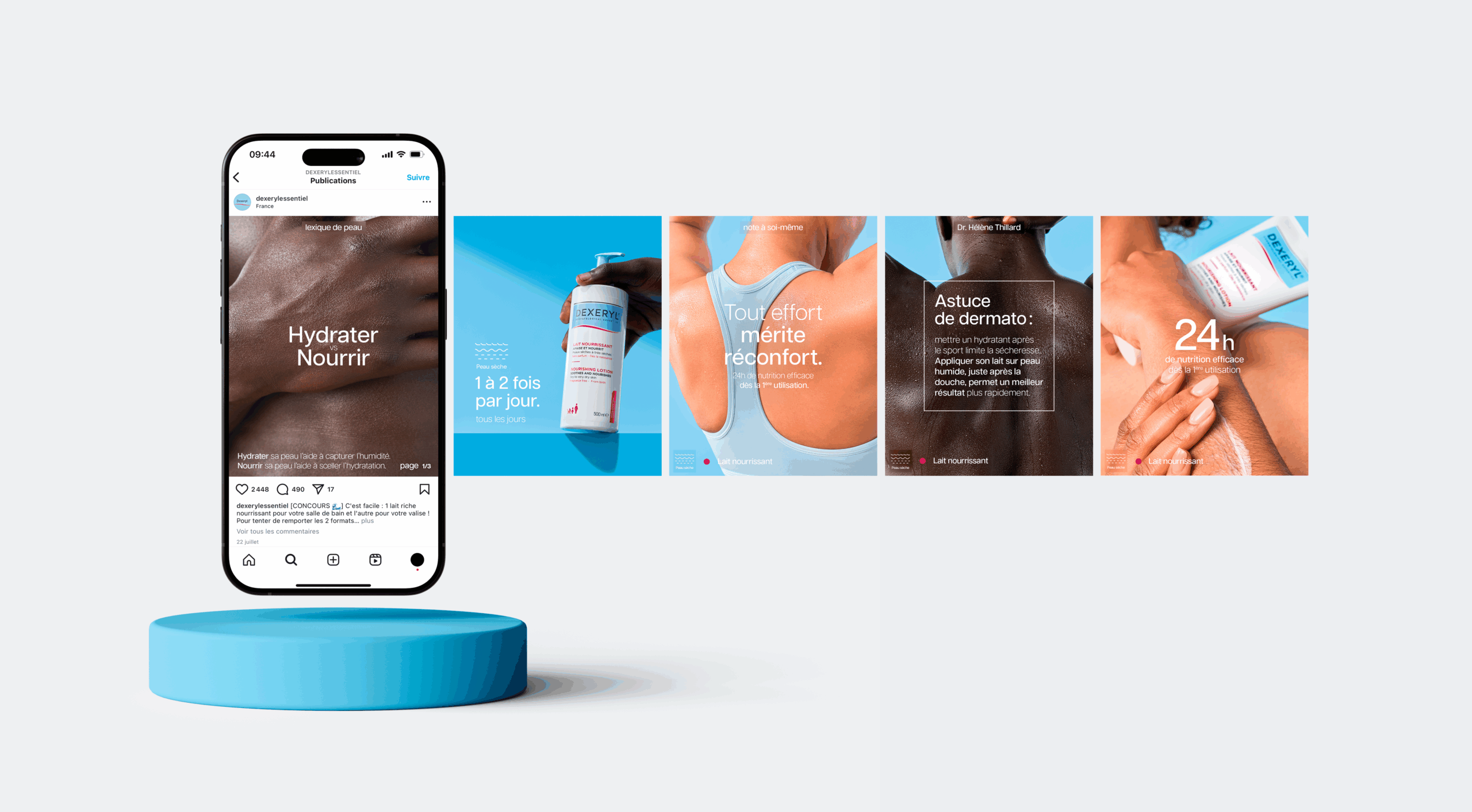 Fruit de cette collaboration, une première campagne 360° (social media et print) dédiée à l’un de ses produits phares : le lait nourrissant Dexeryl. Pour asseoir la volonté d’accessibilité et d’inclusivité de la marque, Orès a fait le choix de sélectionner des modèles photos non-reconnaissables et s’est appuyé sur des codes graphiques épurés et modernes.